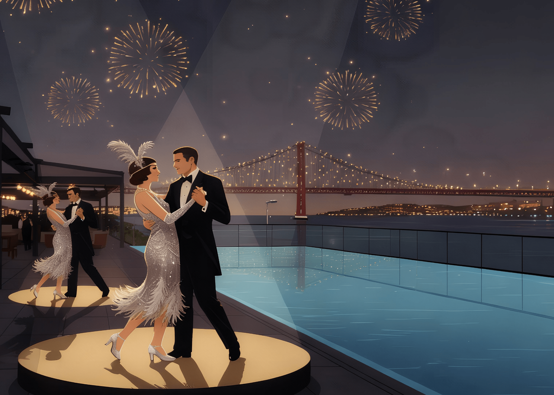 A noite reúne alta gastronomia, atuações ao vivo e a energia vibrante da contagem decrescente junto ao Tejo.